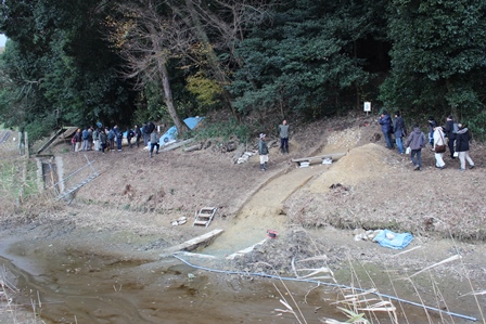 ◆第8トレンチの赤土が遠目にもなんだろうと思った。地山かどうか。いずれにせよ、この位置は後円部の下段斜面ないし、陸橋移行部くらいになりそう。なんとなく、この堤は下段に取り付き、最下段は陸橋にぶつかって終わり、となっているのでは。ここより手前の前方部側は最下段に取り付く陸橋だが、後円部の背後近くにまわってきた第8トレンチのところでは、周囲からの掘削も深くなり、陸橋も高く、下段に取り付くものと復元できるのではないか。