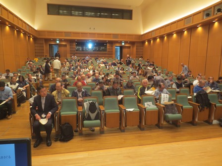 がだいたい埋まり、みなさん熱心に聞いていただいた。3本の講演で一休みし、第2部からわたしも登壇し、最初は、ごく短く3人の方に関連のコメントやっていただきディスカッションに入る。