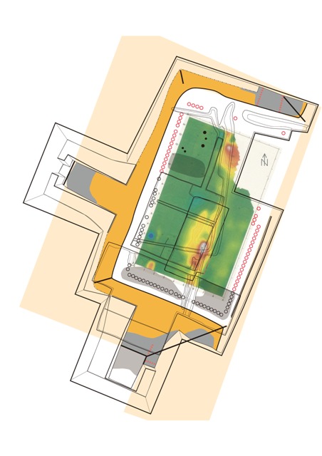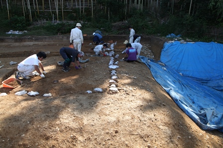 ◆現地説明会にむけて全面シートをめくり、造り出しの全容があらわとなる。学生らは南辺を中心