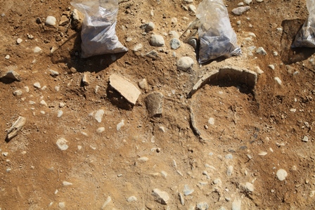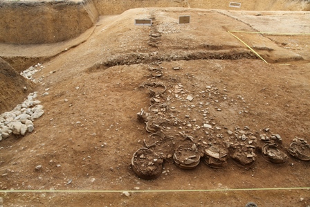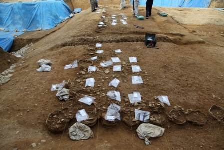 ◆東南隅部埴輪片の取り上げ、造り出し上面の検出を継続する。本日でおよそ目処がついてきた。平行して2人で、北半部の土器供献部の既出のものを下部まで出し、上面を仕上げていく作業に入る。途中から、東南隅部から2人が合流し、およそ土器を露呈させていくことができた。新たに完形品が出てくる地点はないが、既出のものの姿形がはっきりし、その周囲の若干の下げも、だいたい終了してくる。小片はパラパラと散っており、これは位置を記録して取り上げた。