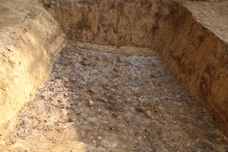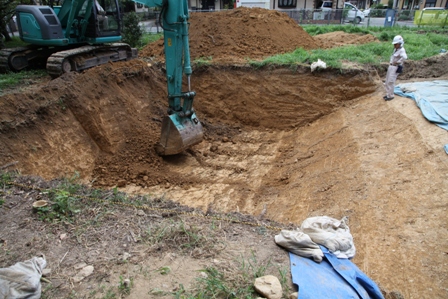 ◆本日、大型重機の最終日。西区の深掘りにかかる(全体写真の右端に写っています)。午前で掘り上がれば、今日も午後は調査区成形をと考えていたが、既存の排土の移動もあり、午後いっぱいまでかかる。。途中で、わずかに濠内堆積土が顔を出すが急傾斜の印象。それと、な んとか西端で、わずかに濠内堆積土が顔を出し、その堆積状況からするとフラットに見え、濠底をとらえており。造り出し西裾部は調査区内で検出できそうである。南北の谷部と異なり、オープンな濠に面しているため、多くの転落石が裾に溜まっている様子はない。ほぼ一発勝負で葺石残存面が出てきそうである。