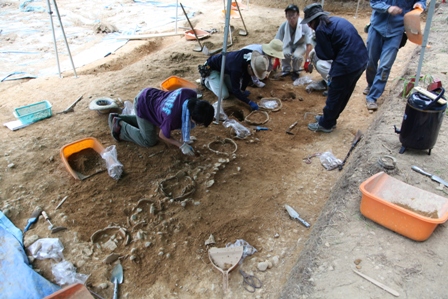 ◆くびれ部の水かえをして全員、東北区に入る。墳丘側の東から西に削っていく者、造り出し上面の南側から北へ削っていく者、くびれ部の谷間の黄色粘質土を削る者に分かれて開始。黄色粘質土はがんがん内側から下げていく。くびれ部谷間および造り出し北斜面とも、抜けもあるが、かなり上から葺石が残存している。