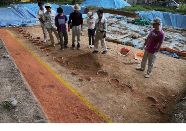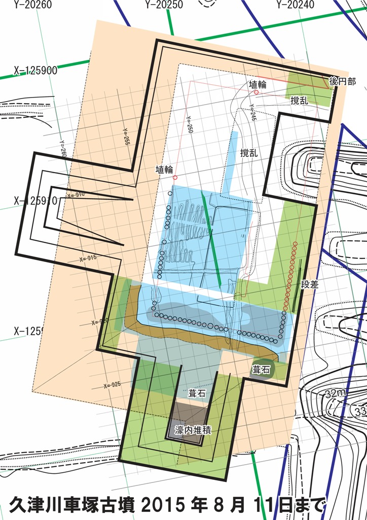 ンがおおむね出てきており、ほぼ埴輪列とも平行し、前方部残丘でいいのではないかと思う。洪水前の景観は想像できないが、幅20m出10m程度の造り出し土壇が濠に飛び出し、埴輪も黄色土がかぶることから頭を出していたものもあったはず。前方部下段テラスとの間には小斜面があったはずだが、葺石はすべてはずされてしまったようである。そこに洪水がかぶる。