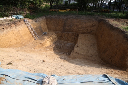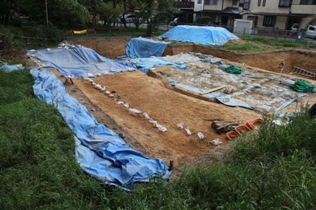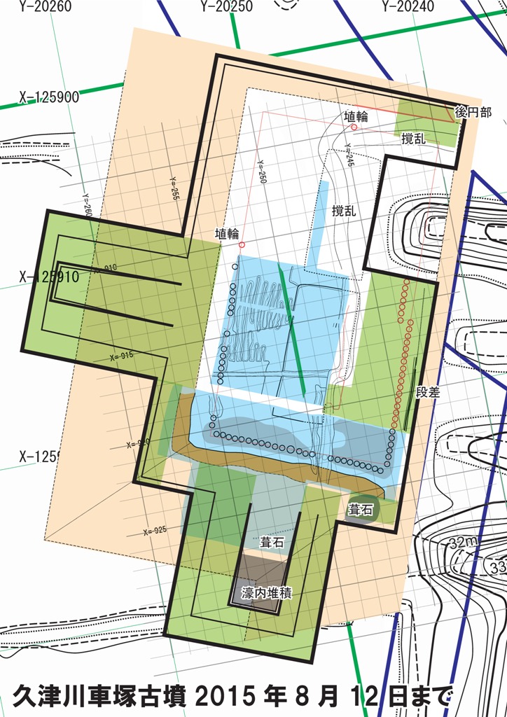 ◆午前中で、重機による南区の下段も掘り上がってきたので、午後からは調査区の成形にかかる。午後やって濠内堆積層まで届く。これで地表か3.5m。転落石上面は、造り出し南斜面に沿う傾きのほか、前方部裾線の東から西への傾きももち、奧の西南では水平近くになっている。安全のため、2mから3mの広げたこともあり、ほぼこのなかで屈曲部が出るかと。あと50㎝は下だろう。隅部に御廟山のような囲形埴輪を期待している。転落石の上端は、濠内堆積土を出したものより、さらに上の位置で、黄色粘質土に覆われ頭を出しており、けっこうよく残っていそうである。図面がたいへんだが。
