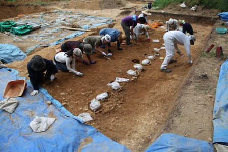 ◆前方部残丘の精査もあとひといき。上面もあとひといき。午後、雨が近づいているとのこと、また予想通り14時にパラパラきたので、今日はここまでとする。ゆっくり休んでくれ。今日明日、お盆で作業員さんもいない。明日は、午前のどこかで造り出し東南区は完了するだろう。西区の深掘り部の調査区成形をやってもいいのだが、かなりの水が溜まっている。発電機をかけてポンプをつっこんでもいいのだが、月曜日にまわし、完了次第、造り出し北辺のくびれ部にとりかかるとしよう(造り出し南辺の葺石を追いかける仕事もある―2人)。