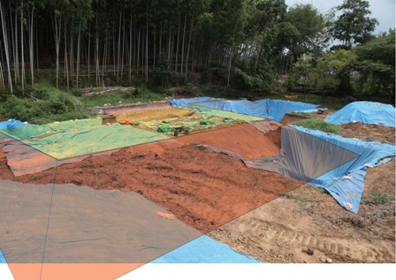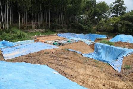 ◆前日、けっこうな雨。薄曇りで、この日中も雨が落ちてきそう。現場に向かおうとすると雨が降ってきたので、現地説明会にむけての埴輪のピックアップをする。そのあと造り出し上面東南区のシートの水排出(バケツリレー)、シートはがし。濡れたシートをまくっていたのでドロドロです。
