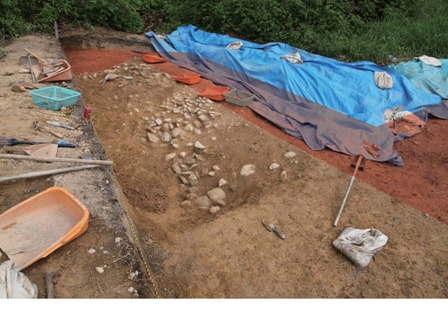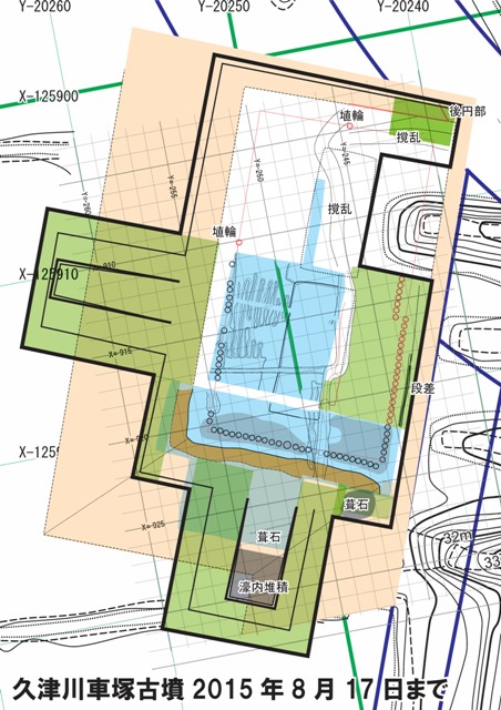 ◆上面はほぼ仕上がり(赤部分)、上部の石際の処理を進めるが、石の目地出しはまだしばらくかかる。一方、くびれ部谷間は、1m弱は下がり、造り出し北斜面の葺石がず~と検出されてい く。本日の終わり頃には、調査区の範囲の最下部まで、石のツラが見