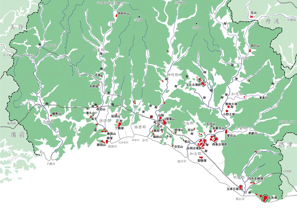 いく。そうしないと頭に入らんわけです。播磨は、遙か昔、加古川の講演会の時に手作りしたものがある。地図のコピーに山の裾線を入れ、トレペをかけてスクリーントーンを貼り、切っていく。たぶん、それは原版として保管し、それをコピーして、ロットリングで古墳を書き込んで行った?、いや直接?、忘却の彼方です。どっかに原版があるかもしれません。まあよくトーンを切ったもんですわ。えんえんと。