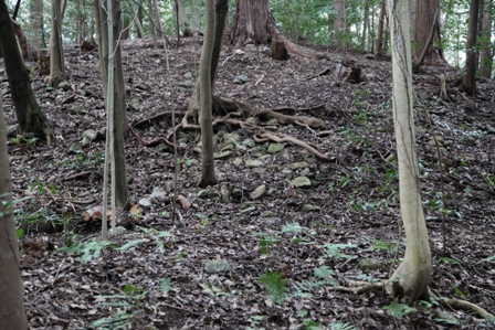 ◆迫力があった、見応えがあった。なかなかよかったです。なぜか、まあよく残っているわけです。基底の切石や靴石などの構造物も適度にあるし、葺石がかなり見え(上)、そして8角の斜面がよくわかり、その下の方形の段も含め、あまり後世の改変なく、こっそり残っているという様子である(下)。