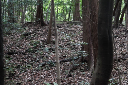 ◆要するに石室開口部、そこから続く墓道、その位置に据えてあるということだ。確か、アオキノ山陵記では天武陵でもそうした石がある記述があったような。完全に石槨を埋め込むのは7末まで下り、天武陵は石室で短いながら羨道がある。だから、おそらくハの字にやや開く墓道があり、石室開口部の扉的施設が見えるような完成形であったのだろう。おそらく盗掘もされているのでは。今日の話では、山科は禁裏御料となり、天智陵は大事に守られてきたとされるが。なので、おそらく修陵段階で、窪んでいるところに土を入れ、封鎖したのではないだろうか。