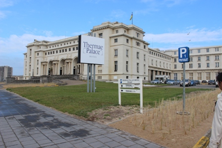 ◆ホテルの名前はテルマエパレス。ちゃんと調べてないが、1930年代に建てられたもの。スウィートルームに案内されたが、ツインベッドが2セット置いてあった。部屋には設計図が額縁に入れて壁に掛けてあり、パリの設計事務所で設計されたようで、サインを見ると、1934年だか、そんな日付だった。ロビーのところにモノクロ写真が拡大してあって、完成して間がない頃のホテルの様子や海水浴客の様子がわかる。全室海に面して