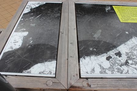 ◆浜辺では高校生がやってきて、いろんな遊びをやって騒いでいる。カミさんはさっそく会場に出向き、こっちは原稿を書きはじめる。途中、海というかホテルの外へ出る。2030年の姿みたいな地図があり、オステンドの位置を確かめる。画像では見えないと思いますが、木枠に地図を金属板に焼き付けたものが2枚ならんでいる。右側の右寄りがオステンドで、右側の木枠近くがダンケルク、左側のまん中くらいがカレーである。その横の海の中を通る線が、英仏の海底トンネル。2030年というのは、どうも海の利用のことのようで、風力発電を示すんだろうなと思われるものが並んでいたり、人工の島を表現したのかと思われるものがあったり、そんな将来像を示しているらしい。