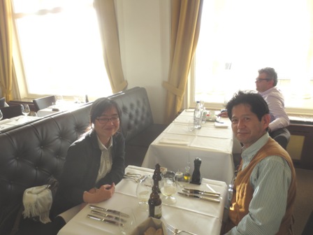 うちに時間も経ち、ホテルに帰ってレストランに行くことにする。ワインを頼み、メニューを見てもよくわからんが、前菜の1品とメインは鶏肉にしたのかな。デジカメを見て、店の人が写真を撮りましょうと申し出、撮ってもらいました。珍しいツーショット写真です。