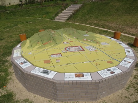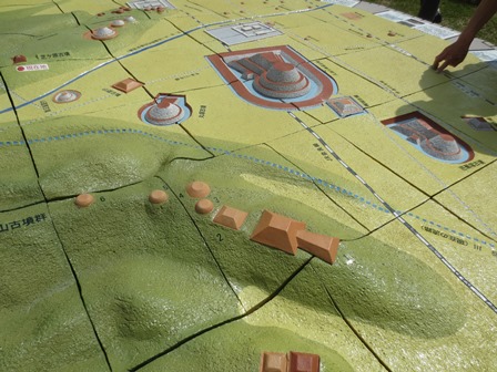 設置された 周辺地形模型を初めて見 た。なかなかいいもんですよ。基本的に粘土キューブから等高線をもとに地形を削りだし、古墳等を造形し、仕上げていったもの。ただし、やはり焼き物であり、また地形模型なので厚みが一定でないこともあり、焼き上がるとひずみが生まれる。もともと合体させるときにはぴたっと密着させるものでないのだが(これは雨で溜まらない点では有効)、その隙間の間隔が違っていたり、隣り合っている面での高さの段差も見える。