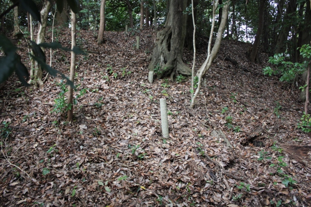 円柱が立ててあり、立入り観察する上で基本的な位置の手がかりになる。写真は、ひとつの稜角部のみ、上の段も追究したのか、何本もコンクリート柱を立てている箇所。ほかは基本的に裾部の2本。こんなことは、『牽牛子塚』の報告書まで知らなかったわけだが、それを知れば、外からでも何とか視認でき、裾部の位置のイメージをつかむことができる。