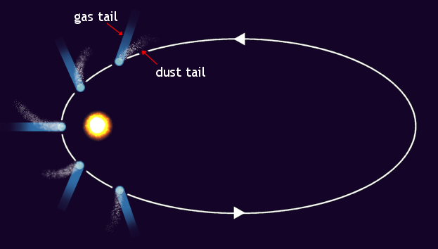尾が伸びた姿から日本語では箒星(ほうきぼし)とも呼ばれる。英語ではコメット。天体写真が