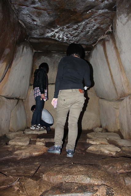 ◆石室は、なんだかずれているのか、石と石の隙間が空いていっている感じ。前に見ていた写真とは異なり、羨道の天井石がすっかりポッカリ10㎝ほど空いている接続部があって、そこから封土が落ちてきた高まりがある。それから前壁の石が薄く立てて使ってあり、羨道の最初の天井石との間にも隙間ができている。