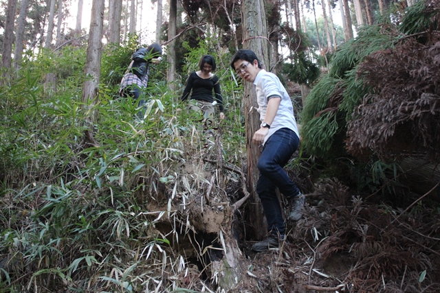 ◆場所もルートもわかったが、急な斜面の登りに加え、植林した木をバサバサ伐採してあり、横倒しにしたまま放置してあり、山道がふさがれている。それをのりこえくぐり、なんとかたどりつく。もう夕刻がせまっている。