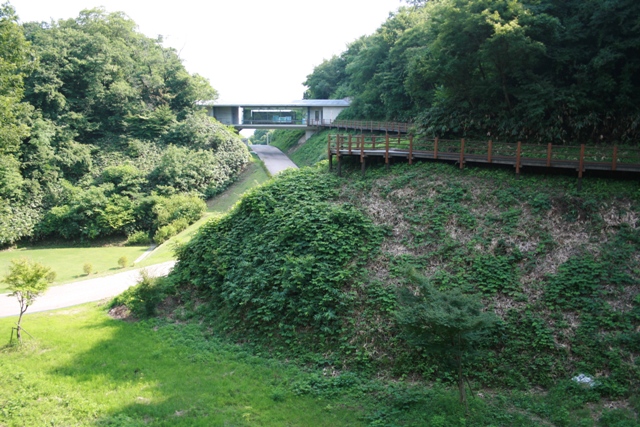 く。やがて、右手に尾根の張り出しがあり、そうそう、こんなところだったと思い出す。階段を上がり、埋納坑の脇に立つ。けっこう暑かったような。そこから山の斜面に等高線に沿って木製の歩道が通してあり、埋納坑ポイントを横から眺められるようにしてある。