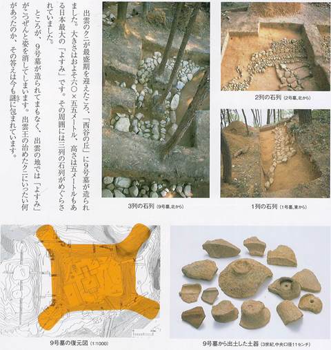 ◆丘を上がっていき史跡公園へ。3号墓には埋葬施設の表示がなされている。この発掘報告書は、まだ・・・なんでしょうね。隣に2号墓(写真)、史跡整備に際して新たに出雲市が調査し、復元した四隅である。墳丘北側が大きく削られているため、調査の上、なかに入れるような空間を作り復元し、3号墓をモデルに四隅墓の埋葬施設を復元的に示す。こういうの、埼玉の鉄砲山古墳が最初なんでしょうか。