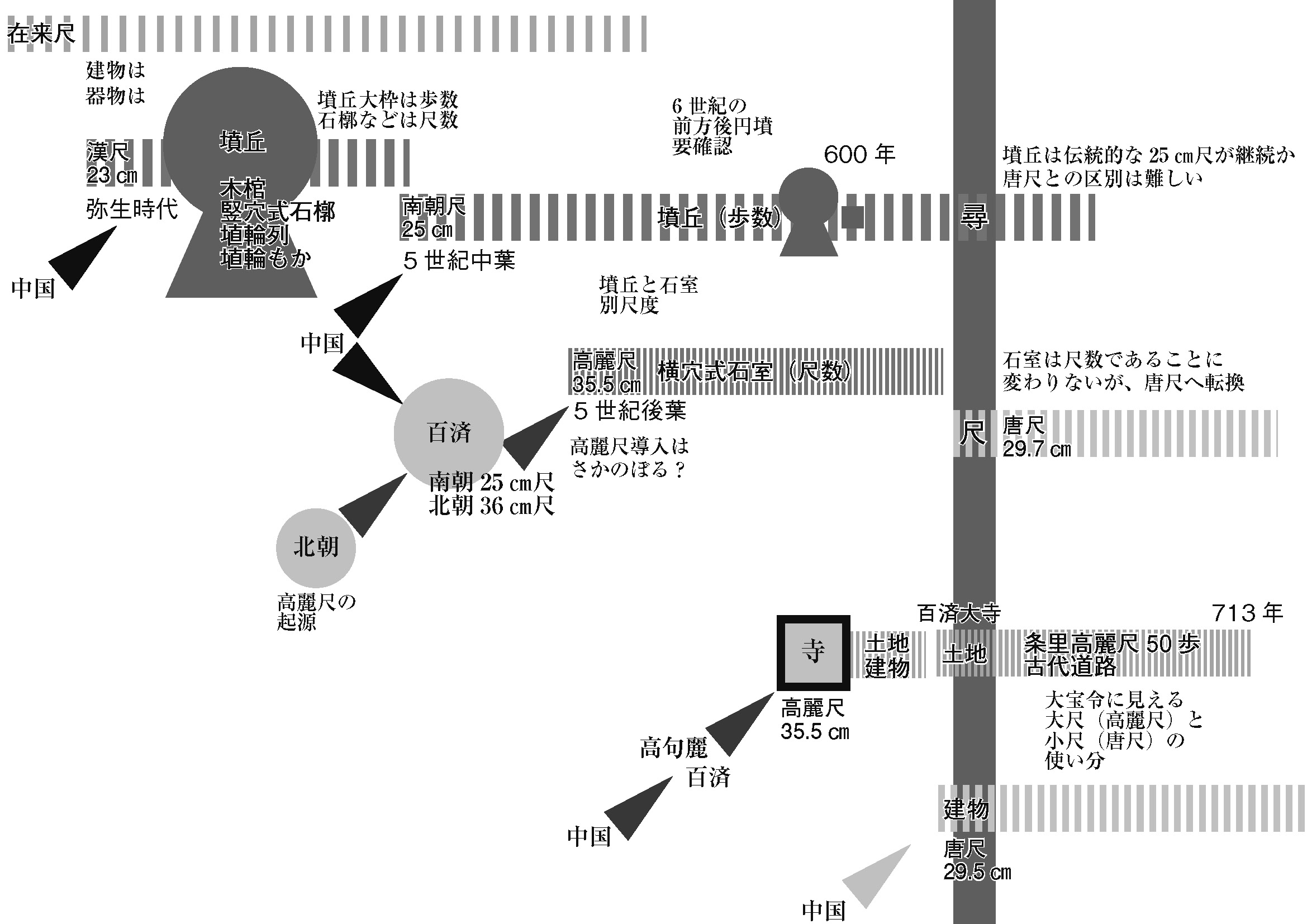 ◆大歴の例会報告でこしらえた模式図を示しておく。高麗尺はだから、日本では横穴式石室に特化しており、7世紀に度地尺となるのは、寺院建築にともなって再上陸し、それが普及すると考えた方がいいと思っている。いかがでしょうか(時間軸が明確ではありませんが・・・。縦の帯は改新ですよ)。