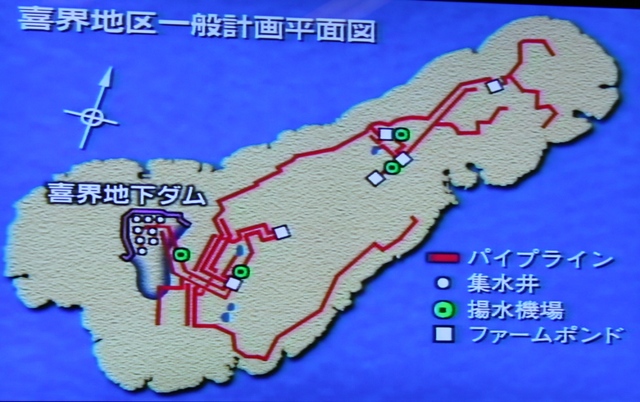 を開け、刳り抜いて、コンクリートを流し込む。こうしてできあがったL字で囲まれる部分の石灰岩土壌のなかの水分は、遮蔽され、抜けてしまうことなく滞留する。それをポンプアップし、パイプラインで島中に水を引くというものだ。いったい総工費はいくらくらいなんだろうか。百億円オーダー?。