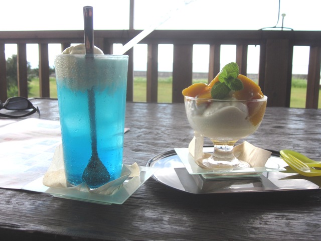 洒落た店がある。疲れたので店に入り、海を眺めるベランダで憩う(とはいえ手前の防潮堤が邪魔)。