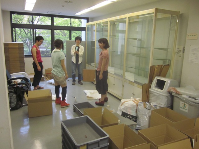 ◆午前で考古学実習室を終えていた道上君に、午後、引き続きやってもらう。見に行くと、ほかの院生3人が手伝ってくれているではないか。道上君を入れて、彼ら彼女等が2回生または3回生の時に、展示ケースを2階に下ろしたのである。3年前?ということか。