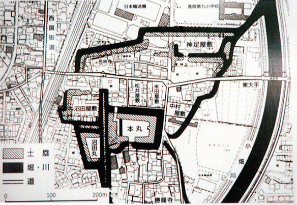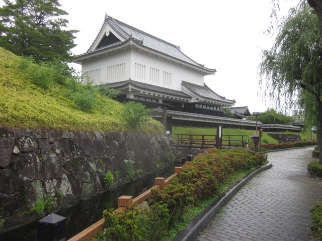 ◆が、これって中は当時のものとは関係のない公園だし、事務棟も関係のないつくりもの。1992年にできたそうだが、どうも市長の独断と強い意向により推進された、現代の城風公園なのかもしれない。あまり不確かなまま適当なことは書けないが、なんだかな~と思いつつ中の展示を見る。ここでもガイドさんが熱心に説明をしてくれる。それにしても、細川でしょ、護煕元首相でしょ、熊本に行けばまだ殿らしいが、室町幕府の管領で、戦国を生き抜き、まあよく続いたわけで、いろんな資料がある。でそれらは、東京だか、財団法人の管理する博物館ができているそうだ(忘れた)。こないだ大阪城石垣のリーフレットを作ったが、そこに見えるのが、九曜紋の細川家の丁場だし、『ヒストリア』特集号でやった時も、石垣普請の上で、細川の文書が大きい役割を果たしているみたいだ。そういえば、解説で、室町幕府から与えられた紋に対して、九曜紋は信長にもらったとかそういう話で、二つの紋を復元軒丸瓦に用いている(むろん当時は巴瓦)。