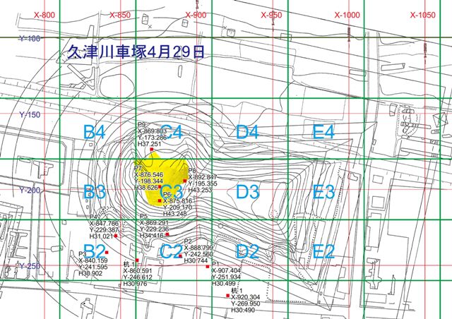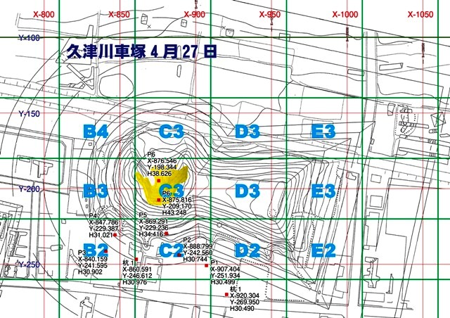◆墳頂のP6から、石棺のあった窪みにP7を落とし、11時過ぎには測量を開始する(すごい)。すべて松岳山にくらべてはるかに順調である。午後も17:30までめいいっぱい測量し、窪みのもっとも奥まった部位は完了した。