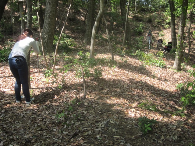 ◆【岸本・山口・嶋野・栗田】9:00~18:00 山口さんと実習生2人。3人いるので、オレは途中まで基本的に枝打ちなどの環境整備。効率を追求せず、せかせかせず、1日参加の実習生にも、3つの役割をそれぞれまわし、面白かったと思って欲しいもの。27日に引き続き、P7に据え、後円部の窪みを測量する。朝、最初に次の展開のため