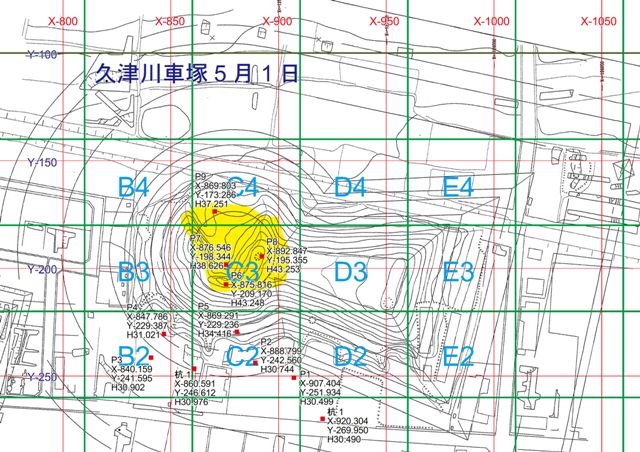 ◆トータルステーションで墳頂の標高を出しつつ、一方でレベルで水準を動かすが、結果は9ミリ、もうレベルも捨てよう。すべてトータルステーションで問題ない。最高点は43.6m。