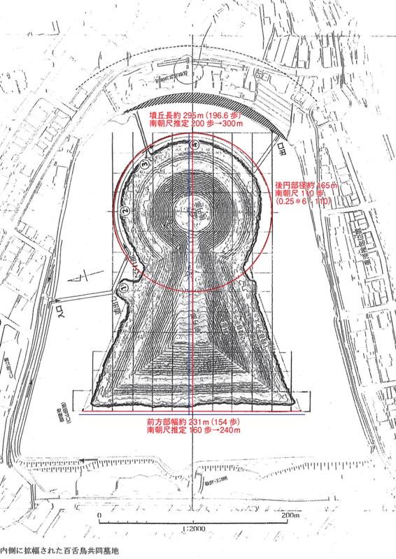 【追記】ちょとやってみました(すみません宮川先生の作成されたものを使わせてもらいます)。宮川先生の復元で、後円部はすんなり110歩だ。墳丘長や幅は、復元線にしたがった寸法で出したものが赤で、その歩数を10歩単位でまとめた案が青です。墳丘長200歩、前方部幅160歩でいいんでしょう。新たなレーザースキャン図もできたし、いよいよぜんぶ設計寸法を決めていくべき段階だ、な。