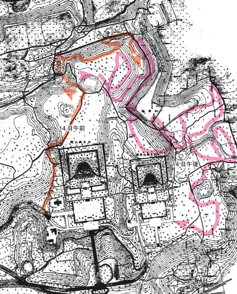 ◆そこから東へ降り、馬場といわれているあたりを観察する。このあたりは陵墓地境界の外とは一続きになっていて、城郭としての防御施設は陵墓図からはわからないが、この東側しばらくのところに自然地形である大きな谷が入る。その南辺では8mくらいドカーンと落ちており、そこを下るのはやめて、西に回り込み、一段下に降りる。