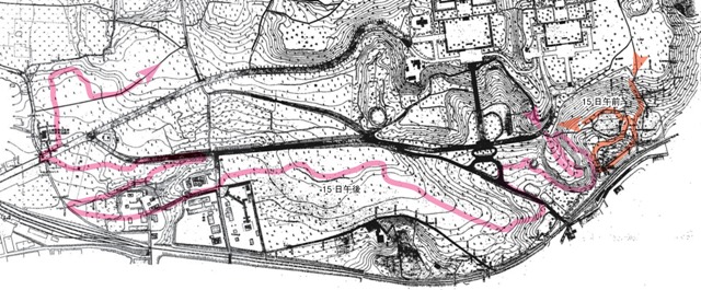 ◆乃木神社のところまで来て休憩。ちょっと筋肉痛気味だし、なにやら眠く、松尾さんが全員に飲み物を買ってくれる(乃木神社内の自動販売機)。なんとか、もう1時間ということで、西へ。指月段階の舟入りということだったか、ここにも谷地形の凹部があり、まず南側の民地に出て、西側まで行ってから陵墓地内の肩部のかなり急峻なところを東に進む。舟入りの東北部には深く谷が入り込み(ある程度人為的か?)、そこを見たあと、参道北側に入る。