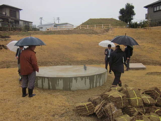 ◆天気予報の通り雨になり、傘をさしながら現地。現状をご確認下さい。手前の16角形の台座が、2013年度に立体模型を置くことになる場所。会議後、城陽での宿泊場所と車塚の基準点を聞く。そう、松岳山のあと、候補を3箇所ほど考えているなかで、小泉さんと約束した久津川車塚を選択。GWに測量にかかろうかと・・・。さて、どうなりますやら。