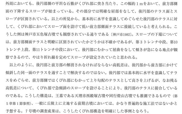 ◆ちなみに、寺澤さんが検出した前方部西北隅付近の葺石が墳丘そのものという点については、「前方後円墳の墳丘規模」『大阪市立大学大学院文学研究科紀要 人文研究』第55巻第2分冊(2004年)に書いたことがあります(右、一部抜粋)。大阪市大のリポジトリで全文PDFでダウンロードできるようになっているはずです。