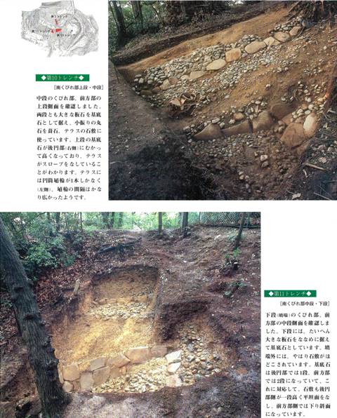 がある(右図)(以下、上から仮に上段・中段・下段・最下段としておこう)。前にも書いたが、側面にテラスがあることそのものは、南側の道路に立てば見える。それと、西求女とか備前車塚にあることも考慮していた。しかしカシコーケンのレーザーで、1面のみならず、ほかにも前面のテラス面が側面にまわってくることが明らかになる。それをふまえて、現地で確認することを最大の目的とした。