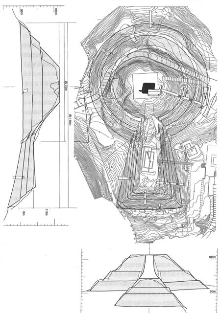 ◆右の写真の南側面でいえば、見えてる斜面の途中に下段と中段の間のテラスがあるようになんとか見え、足下あたりが最下段と下段の間のテラス位置に相当するのではないか、ということです。