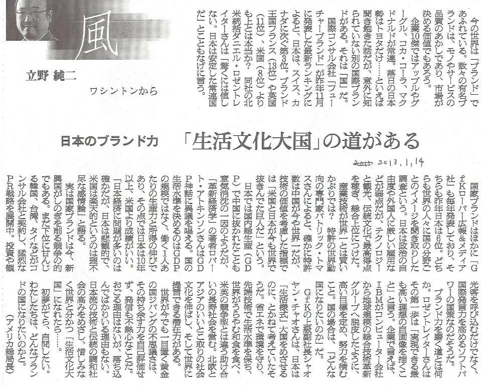 んや、という。で、右の新聞にはなるほど、と。生活文化大国、いいことではないか。GDPがどうであれ、住みよいところだ。驚くほどの、きめこまかな工夫がなされている。外国人が、空港で、日本のトイレを写真に撮っていくそうだ。ウォシュレットもそうだろうが、節水技術に優れ、いかに少量の水で流せるか、そういうことをトコトン追究した製品に、世界は驚くのだとか。いいことではないですか。省エネで、コンパクトでスタイリッシュな製品、使い勝手も機能もよい、そういうものに囲まれて人間らしく生きていく、実に豊かなことではないか。政治的な自由もあり、治安もよい。