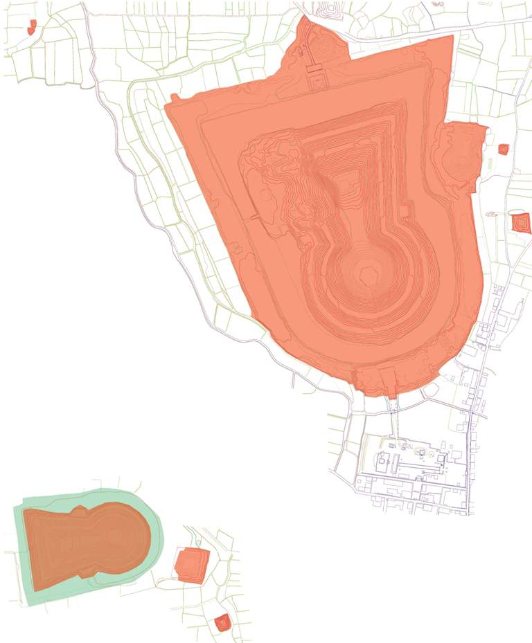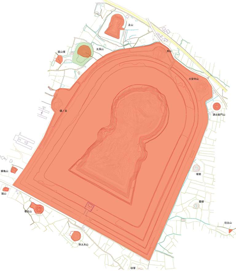 囲の開発が進み、なんとか保存したいと、史跡にすることで乗り越えたのだろう。丸保山は1972、墓山が1975、このあと、応神陵外堤外濠が1978(未記入)。ともに史跡の範囲(緑)はテキトーです。