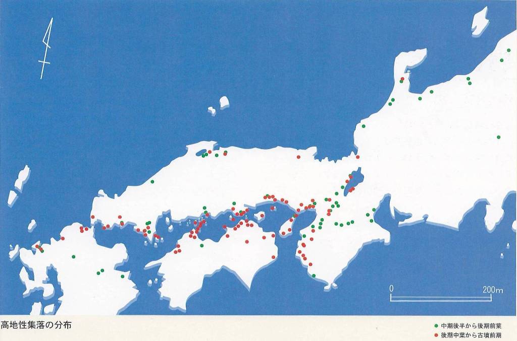 ◆それと高地性聚落。カシコーケンの図録について書きましたが、その同じ図録の高地性集落の図を使わせてもらってます。緑は地域内部の戦争で内陸寄り、赤は瀬戸内沿いの沿岸部であることはハッキリしていると見えます。こういうの、近年はほとんど取り上げられませんよね。
