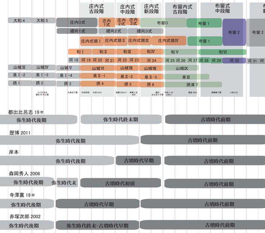 ◆ついでに、こないだ出した庄内・布留の平行関係に、時代区分を加えたものも出しておきます。ただし、実年代が違うんですよね。これはあくまで時期幅とかも関係なく、土器型式の最小単位を均等幅にしたものにすぎない。弥生後期はやっぱりさっぱりわからん。+これにC14を軸に実年代に配列し直すには、まだ遠い。