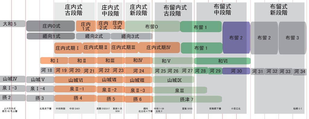 ◆明日の授業のためといいつつ、歴博の原稿のためもあり、前にも少し書いた、畿内の土器編年の表を作る。ひとまず、大阪府文化財センターの『古式土師期の年代学』の表を複製した。これとて異論もあるのかもしれないが、オレには判断つかないので、準拠するほかなし。