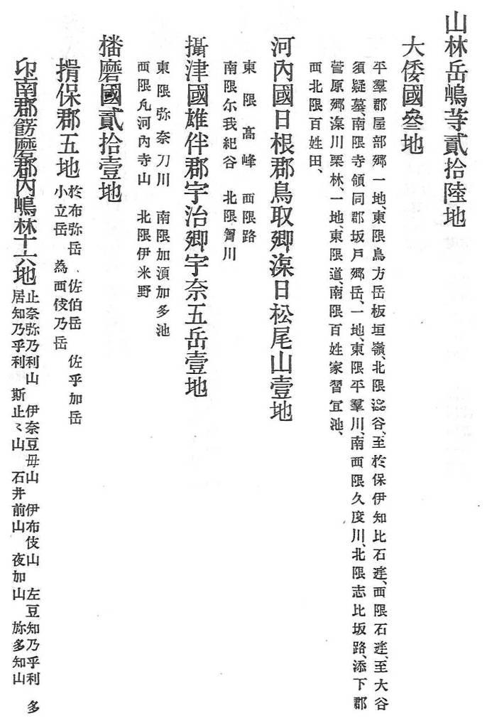 ◆法隆寺の資財帳だ。そのなかに「山林岳嶋等」のリストがある。大和国には3箇所あり、平群郡屋部郷の1箇所、平群郡坂戸郷の「岳」1箇所、添下郡菅原郷の「深川栗林」1箇所が、河内国では「日根郡鳥取郷深日松尾山」1地、摂津国では「雄伴郡宇治郷宇奈五岳」1地とある。四至から現在地の比定も可能であろうが、山岳等の規模はあれ、それぞれ所在地の郷が記されていることは無視できない。『播磨国風土記』をあわせれば、もう郷域があるとしか考えられませんね。