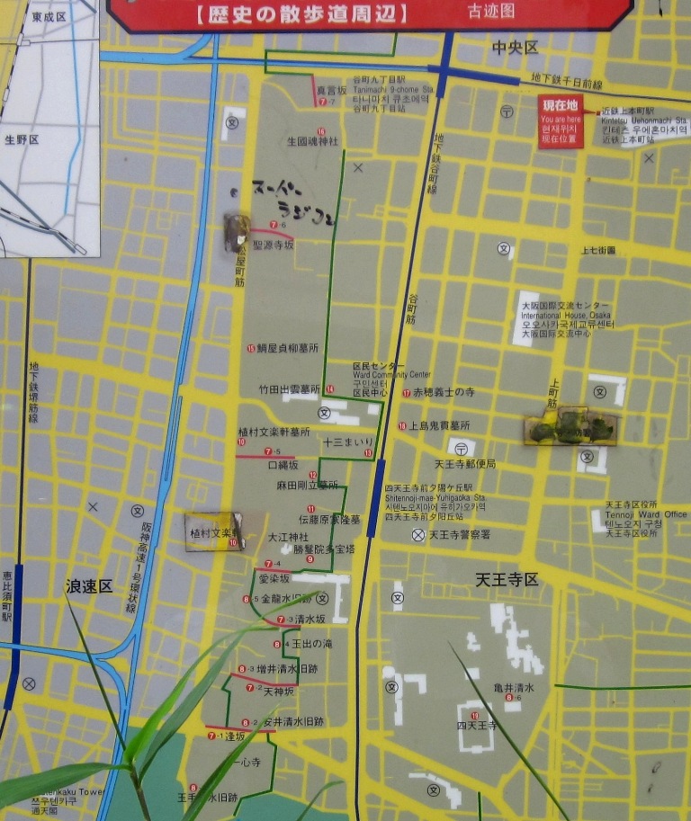 ◆天王寺七坂めぐりは、大阪市も力を入れているのだろうか、地元だろうか。道路に歴史の散歩道のタイルを埋め込んで、散策コースがわかるようになっている。