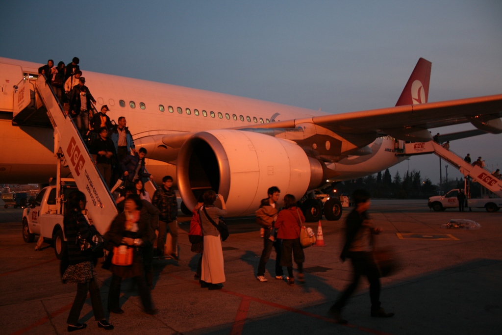 スポラス海峡とダーダネルス海峡の間の海、名前は知らん、に出て、そこからイスタンブール西郊外の空港に近づく。滑走路は南北で南から進入する。高度を下げていくと、街の明かりが窓から見える(座席は中央4列だったので遠いが)。写真は降りてくる人たち。