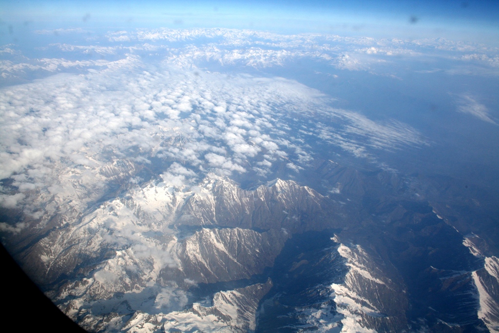 のか、と思っていたら、ありました。遠い雲の先を見ていると、雲にしてはおかしなピラミッドがある。あれがアルプスだな、とわかってみれば、雲の上に聳える山地のならびが認識できる。16:40頃。尖っているところは、よく知らないが、マッターホルンや、アイガーや、ユングフラウや、なんかそんなんなんだろう。全体で三グループくらいに分かれている。東の一群、中央の一群、そしてフランス側の西側の一群である。東・中央は飛行機から遠いが、西側の一群はどんどん近づき、厚みもわかる。手前から横にのびる山地の帯が連なり、そのむこうにいちばん高い峯峯が見える。