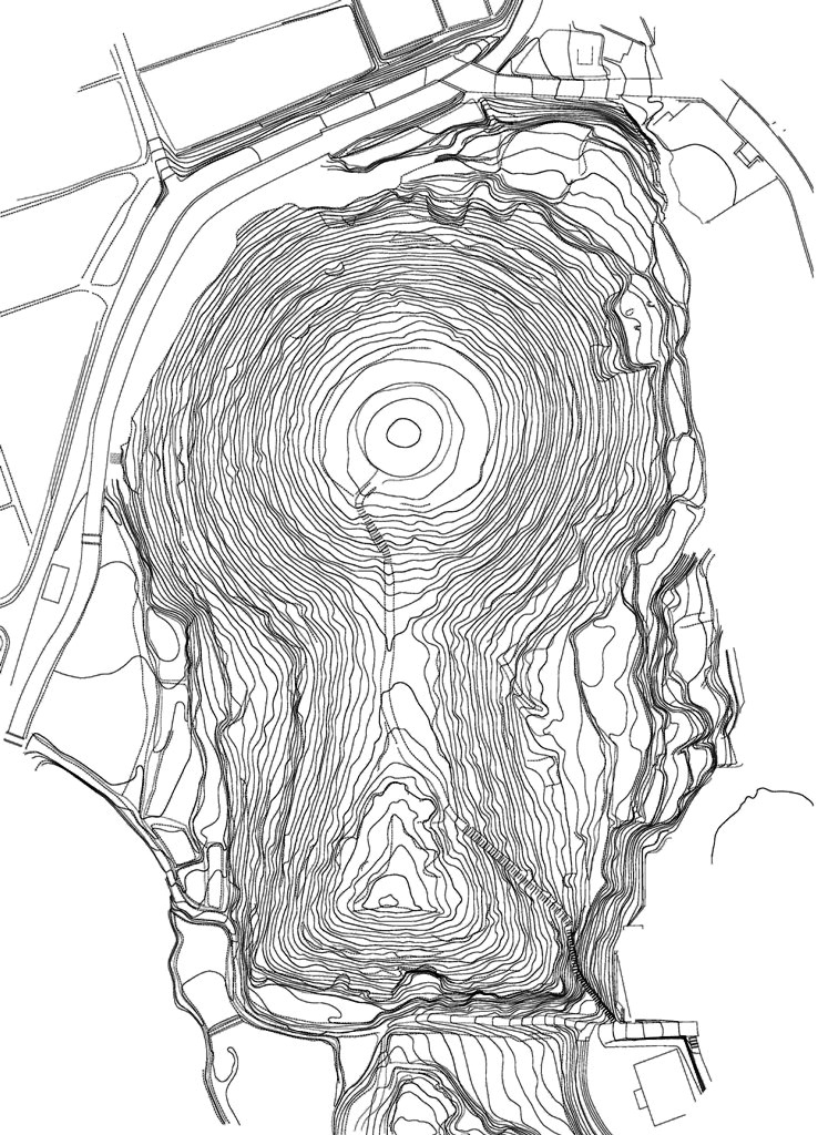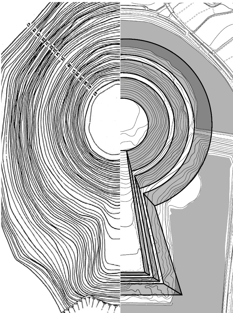 ◆まず、こないだの新規杭P40・41・41にレベルを落とす。次にP40にマシンを据え、茶臼塚南辺の谷部を下ろしていく。ひととおり紙の端まで行き着く。