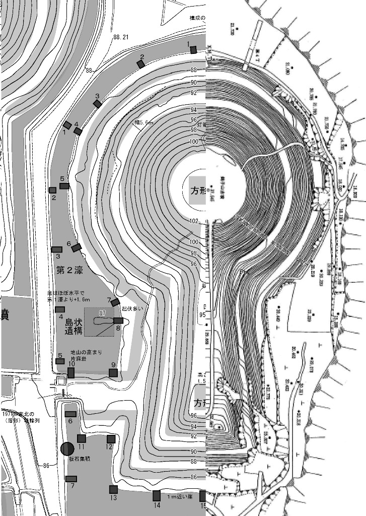 ◆次にP42に据え、土地境界のところに竹を横に積み上げ(測りにくいったらありゃしない)、見通せなかった前方部前端部あたりを完了させる。竹垣のむこうから来る等高線とも矛盾なく接続。